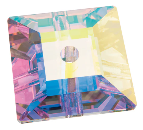 Using crystals, Preciosa sews The loose flat-backed crystals in Square 301 in Crystal have a thread hole that allows them to be stitched into cloth. Four equal sides combine to make the square shape of Preciosa Loch Square crystals, which have a thread hole in the middle, a flat top, and simple bevelled edges.